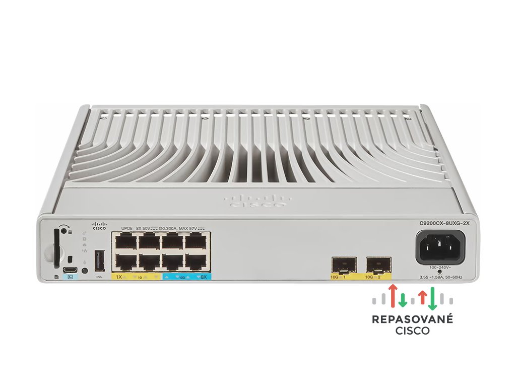 Cisco Catalyst C9200CX-8UXG-2X-E. Typ přepínače: Řízený, Přepínač vrstev: L2/L3. Počet instalovaných modulů SFP+: 2, Počet portů USB 2.0: 1. Plně duplexní režim. Tabulka MAC adres: 32000 pol., Kapacita přepínání: 128 Gbit/s. Síťové standardy: IEEE 802.1D, IEEE 802.1Q, IEEE 802.1p, IEEE 802.1s, IEEE 802.1w, IEEE 802.1x, IEEE 802.3, IEEE.... Podpora napájení po Ethernetu (PoE). Instalace do racku