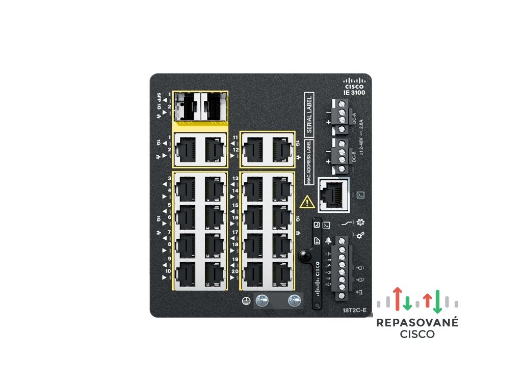 Cisco Catalyst IE3100. Typ přepínače: Řízený, Přepínač vrstev: L2/L3. Typy přepínaných ethernetových portů RJ-45: Gigabit Ethernet (10/100/1000), Počet přepínaných ethernetových portů RJ-45: 18, Počet instalovaných modulů SFP: 2, Konzolový port: RS-232/Micro-USB. Tabulka MAC adres: 8000 pol.. Síťové standardy: IEEE 1588v2, IEEE 802.1D, IEEE 802.1Q, IEEE 802.1ab, IEEE 802.1p, IEEE 802.1s, IEEE 802.1w, IEEE.... Napájecí konektor: Napájecí konektor. Instalace do racku