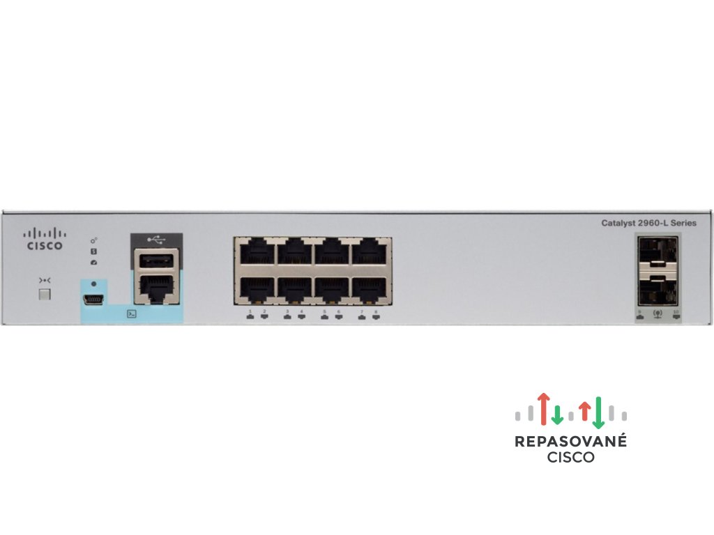 Cisco WS-C2960L-8TS-LL. Typ přepínače: Řízený, Přepínač vrstev: L2. Typy přepínaných ethernetových portů RJ-45: Gigabit Ethernet (10/100/1000), Počet přepínaných ethernetových portů RJ-45: 8, Konzolový port: RJ-45. Plně duplexní režim. Tabulka MAC adres: 16000 pol., Kapacita přepínání: 20 Gbit/s. Síťové standardy: IEEE 802.1D, IEEE 802.1ab, IEEE 802.1af, IEEE 802.1p, IEEE 802.1s, IEEE 802.1w, IEEE 802.1x, IEEE.... Instalace do racku, Formát: 1U